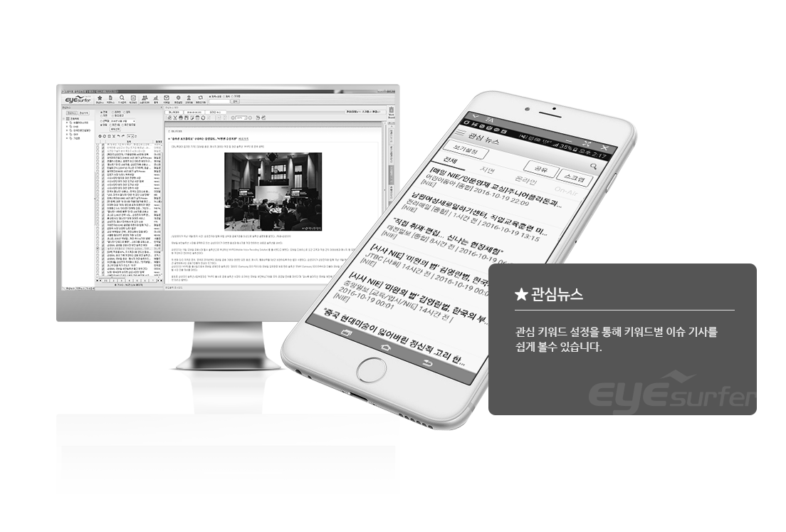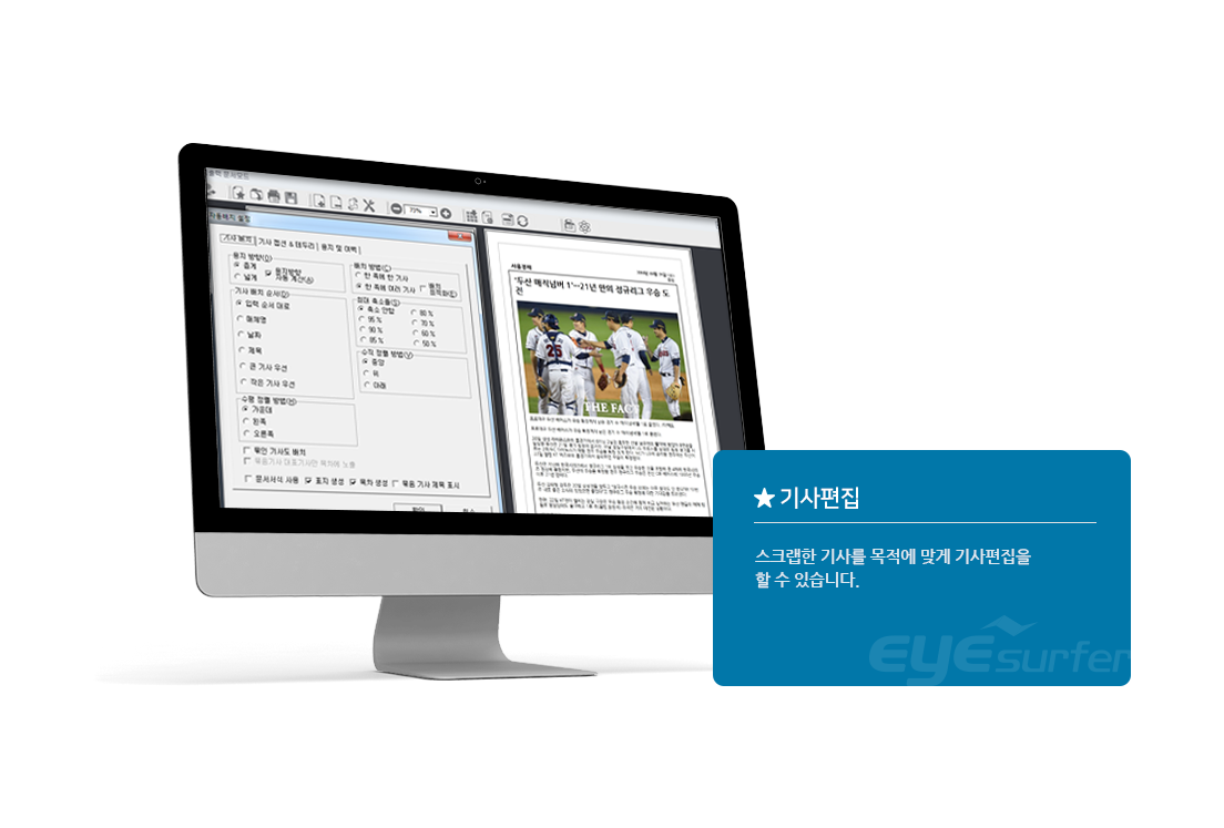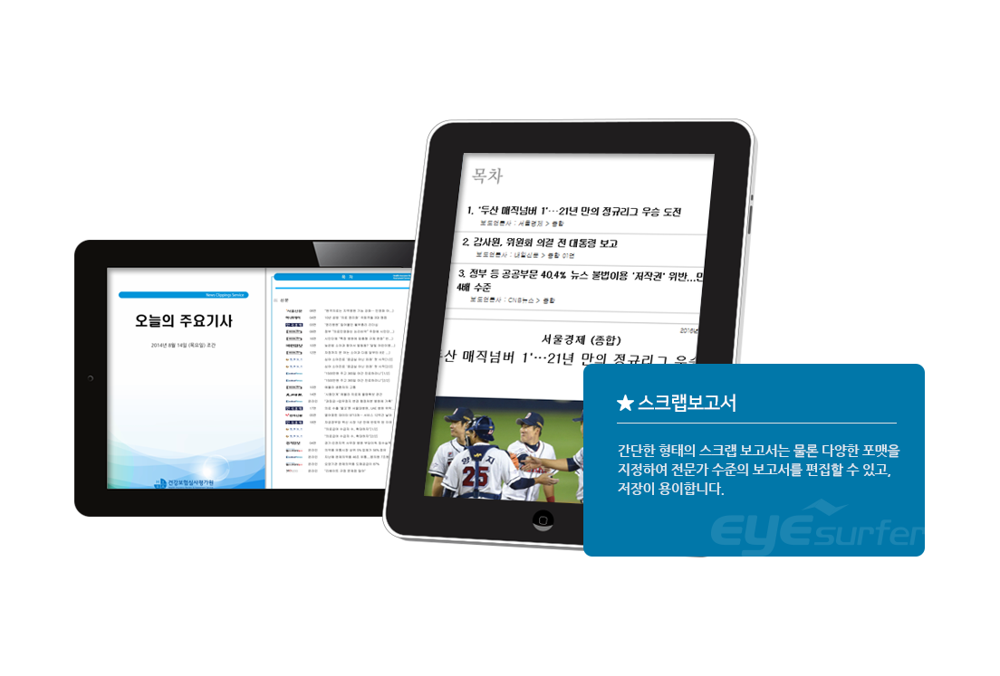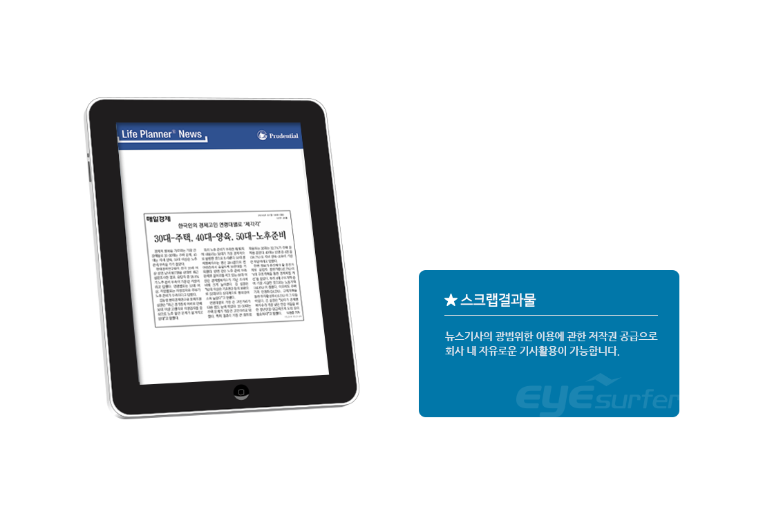 아이서퍼는 국내 최초 지능형 신문스크랩 편집기를 이용하여 고객님께서 원하는 정보를 신문, 잡지, 온라인 뉴스에서