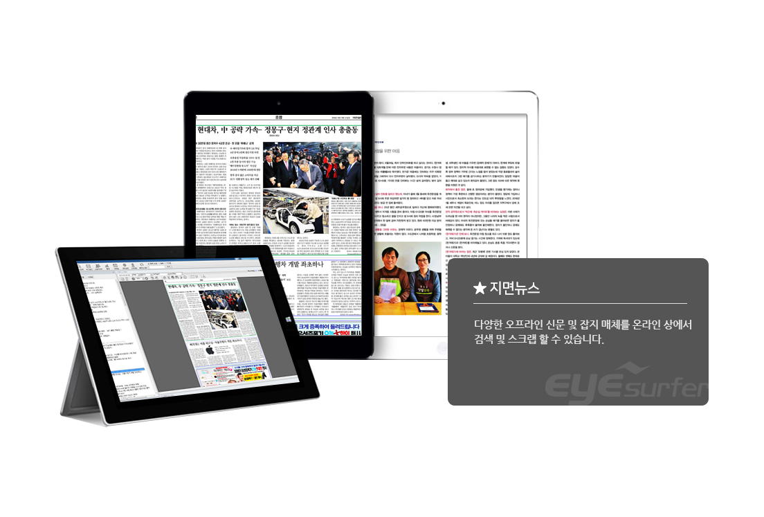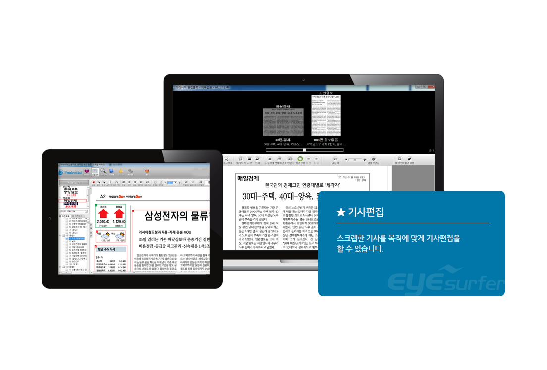 아이서퍼는 국내 최초 지능형 신문스크랩 편집기를 탑재하여 신문/잡지 지면 스크랩은 물론 실시간 뉴스 통합 검색,